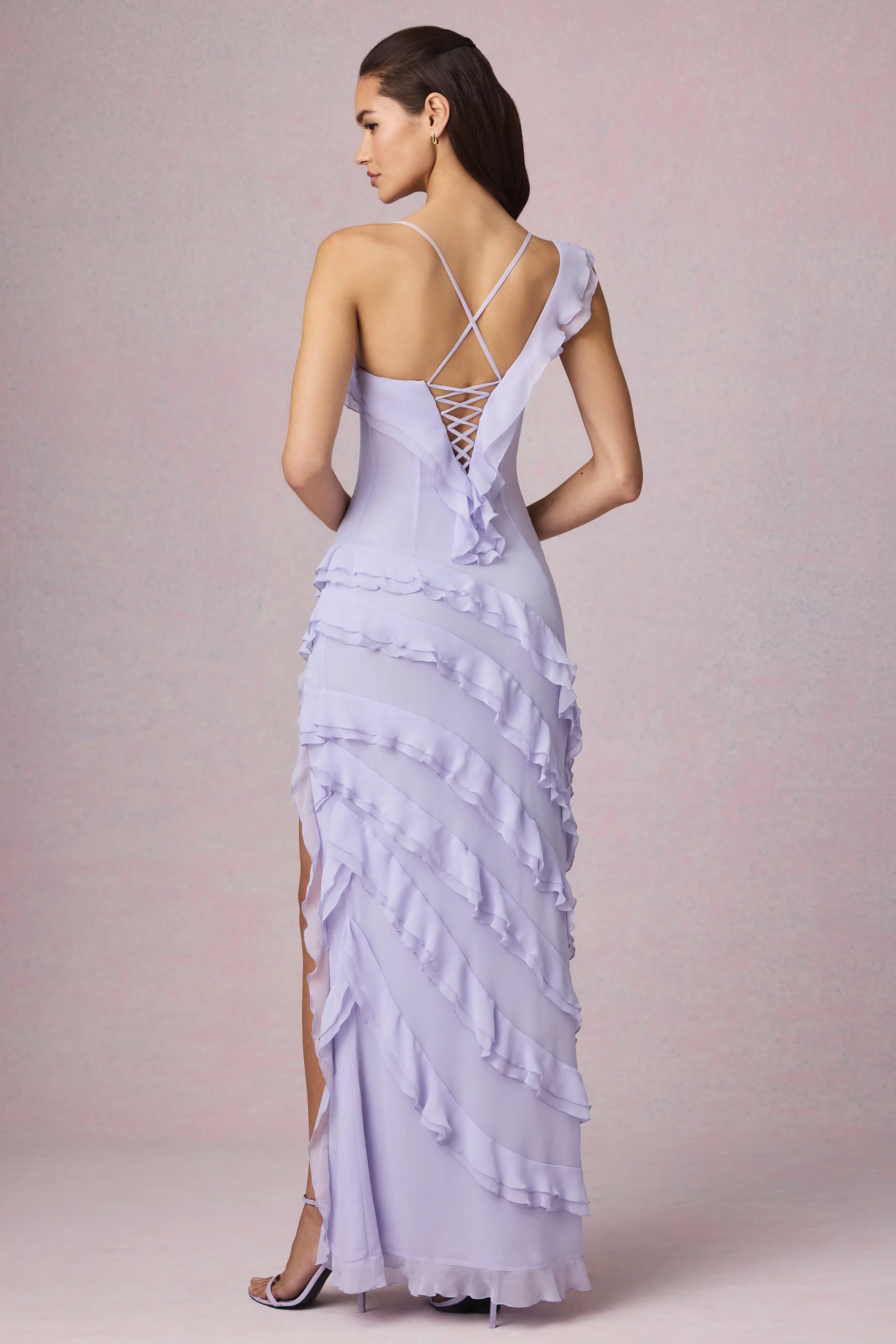 Asymmetric Ruffled Lace-Up Gown in Lilac