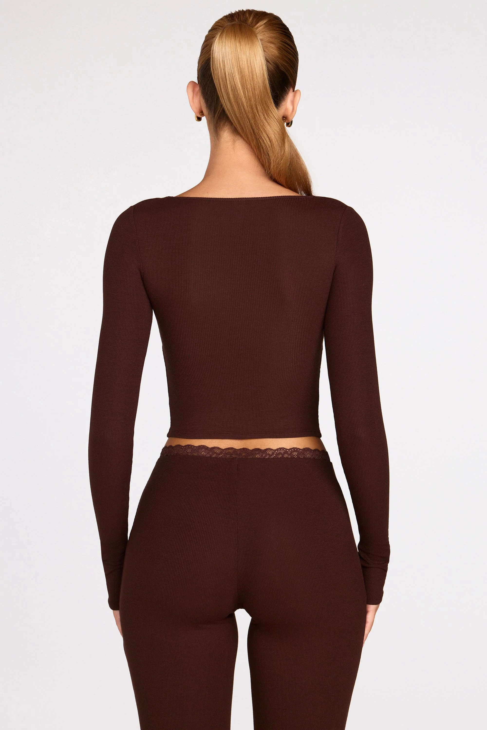 Ribbed Modal Long-Sleeve Laced Bra Top in Chocolate Brown