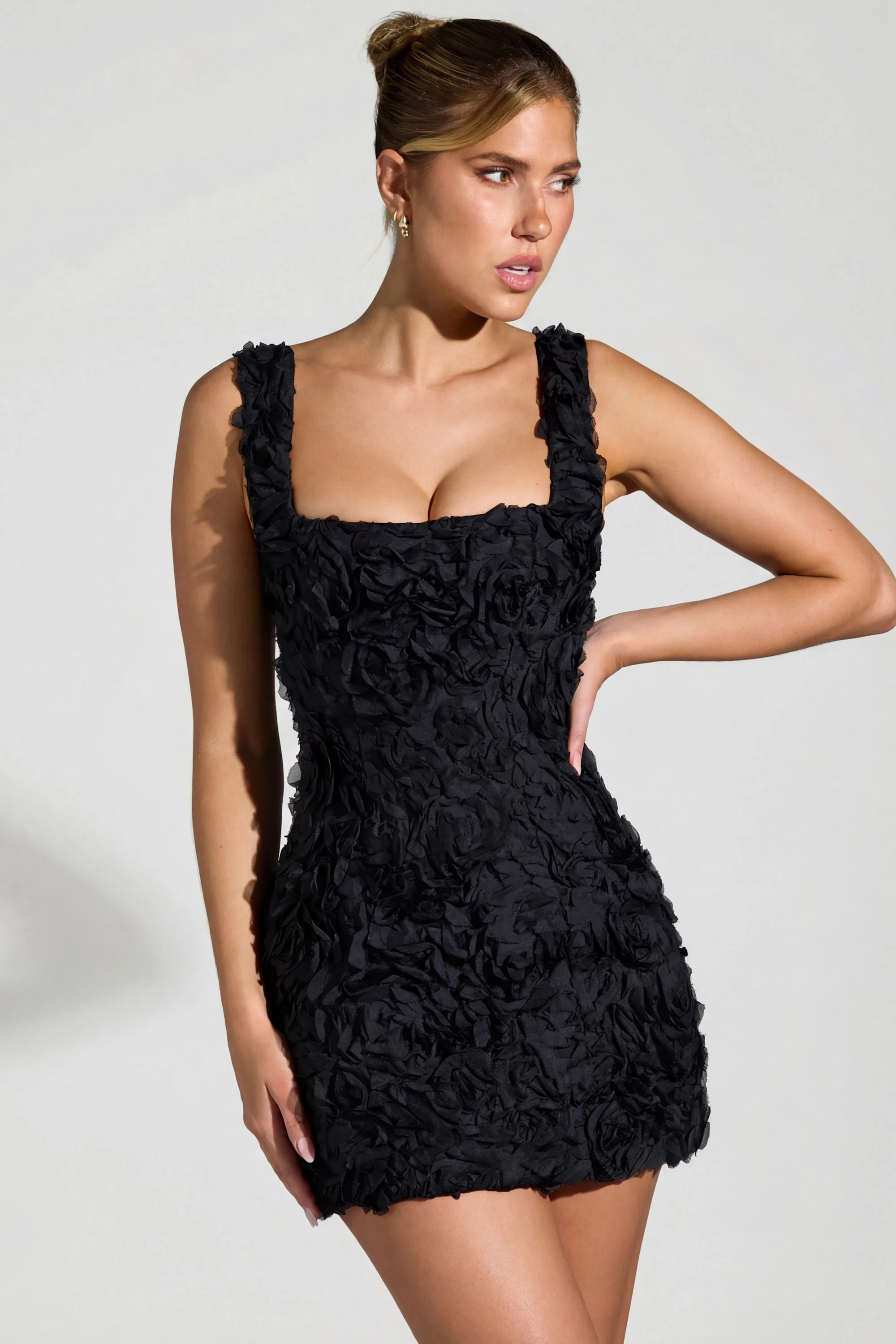 Floral-Appliqué Square-Neck Corset Mini Dress in Black