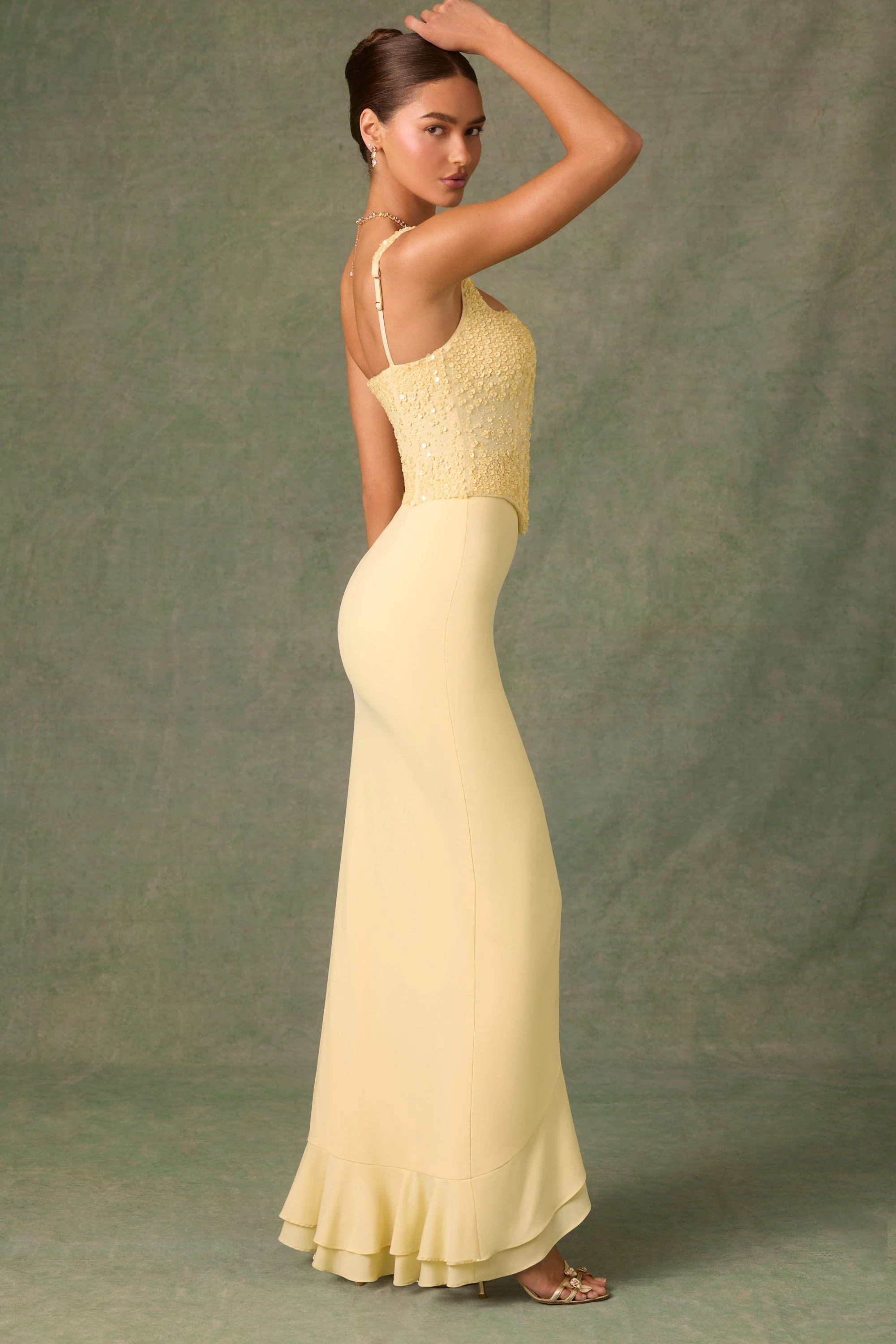 Embellished Ruffle-Trim Corset Gown in Yellow