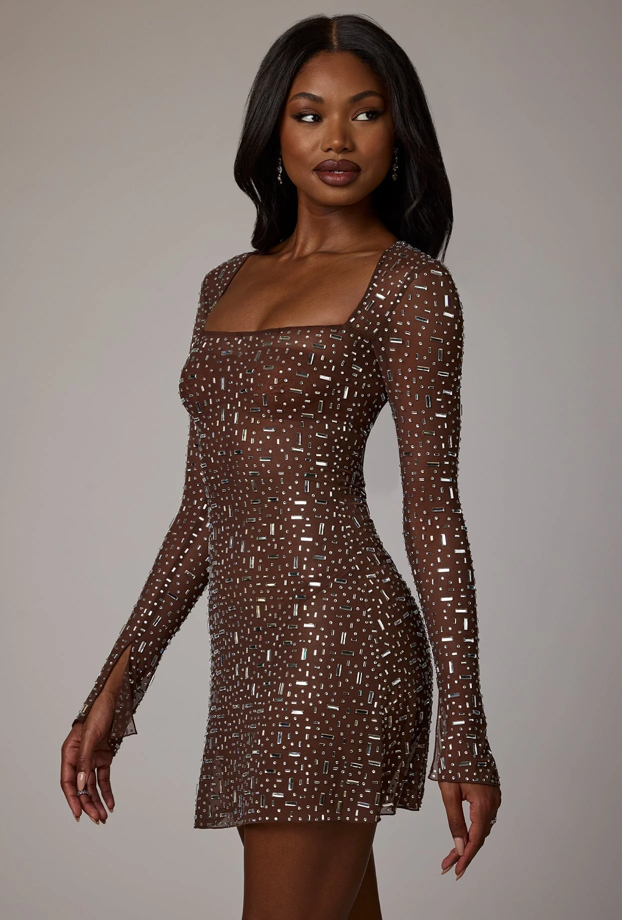 Sheer Embellished Long Sleeve A-Line Mini Dress in Deep Cocoa